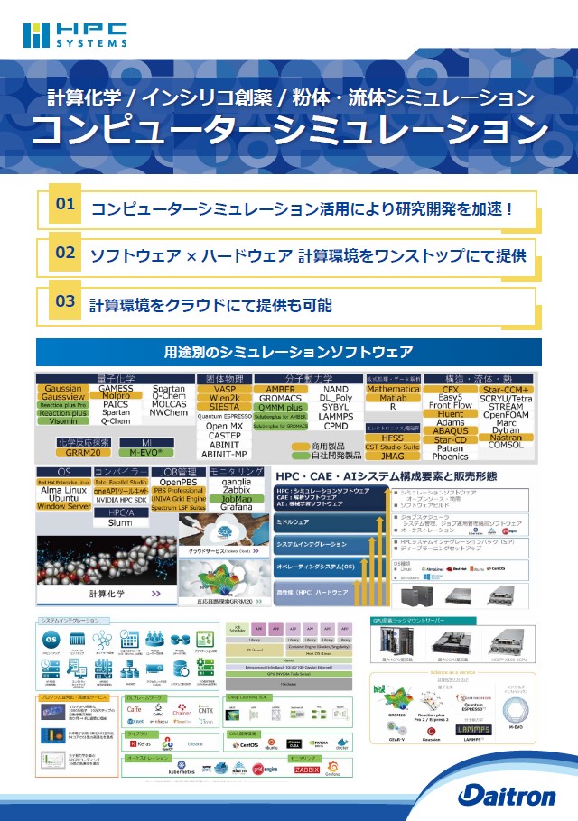 ・先端の基礎研究、素材・材料開発など、研究開発を多角的に支援するワンストップサービスを提供 ・計算化学、MI(マテリアルズ・インフォマティクス)などの技術力で、強力な共同研究・支援・計算能力を提供 ・幅広いシミュレーションソフトウェアをサポート ・最先端のGPUを含めて、計算内容に応じたワークステーションを提供