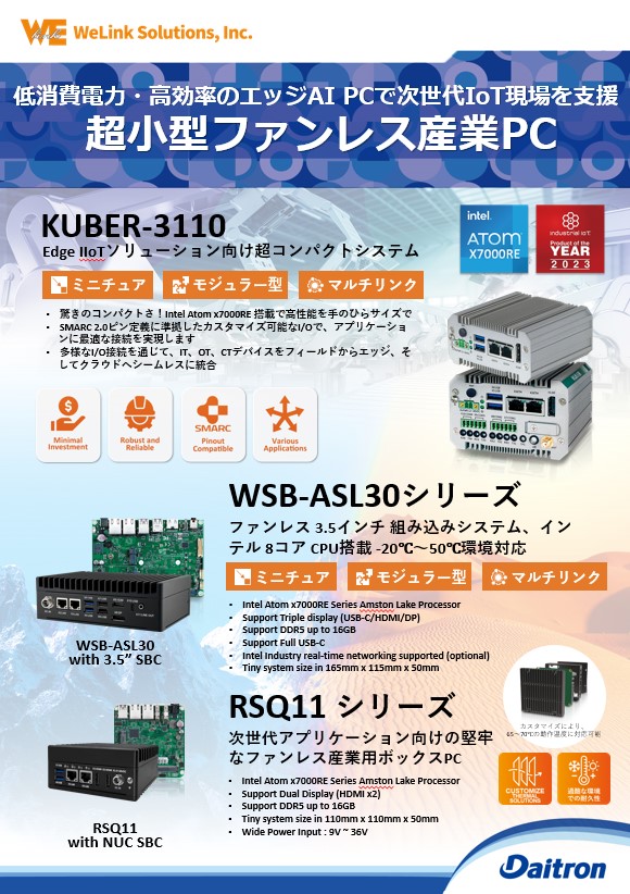 製品概要低消費電力・高効率のエッジAI PCで次世代IoT現場を支援します。製品特長■KUBER-3110:Edge IIoTソリューション向け超コンパクトシステム
