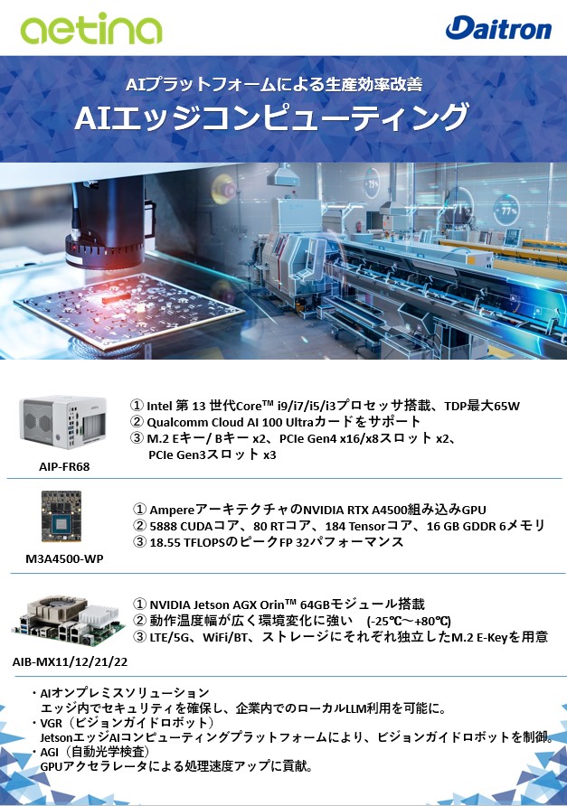 ・AIオンプレミスソリューション エッジ内でセキュリティを確保、企業内でのローカルLLM利用が可能です。 ・VGR(ビジョンガイドロボット) JetsonエッジAIコンピューティングプラットフォームにより、ビジョンガイドロボットを制御します。 ・AGI(自動光学検査) GPUアクセラレータによる処理速度アップに貢献します。