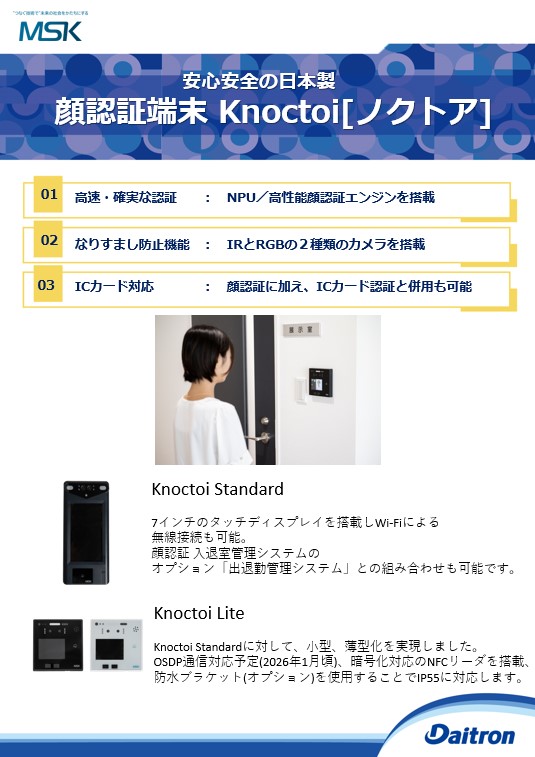 機能概要高速・確実な認証NPU(Neural Processing Unit)を搭載した高性能な端末で、エッジ処理を行うことにより高速な顔認証を実現します。 ハイダイナミックレンジカメラを搭載しているため、逆光下での認証が可能です。なりすまし防止機能IR(赤外線)とRGB(可視光)の2種類のカメラを組み合わせた技術により、写真や動画を使用したなりすましを防止します。 また、顔認証に加え、ICカード認証を併用する二要素認証でセキュリティ強化を実現します。組み合わせ可能な認証方式顔認証:非接触かつハンズフリーでの認証や、マスク着用のままでの認証が可能です。 ICカード認証:FeliCa※4、MIFAREタイプ※5のICカードに対応しています。 二要素認証(顔×ICカード):顔認証とICカード認証の組み合わせによって、高度なセキュリ汎用性の高い端末サーバーと通信ができない状態でも、Knoctoi単体で顔認証することが可能です。 各種インターフェース(接点、RS-485、Wi-Fi※2、Wiegand※3)を搭載しており、さまざまな用途に対応しています。安心安全の日本製神奈川県横浜市に開発拠点、宮城県角田市に生産工場を保有しており、設計・開発・製造といった全ての工程を日本国内で完結しています。セキュリティ対策Knoctoi内に保存された個人情報などの抜き取りを防ぎ、高い耐タンパ性で重要なデータを保護します。さらに、Knoctoi には顔の特徴量データしか保存していないため、元の顔写真を復元することはできません。 - +資料請求