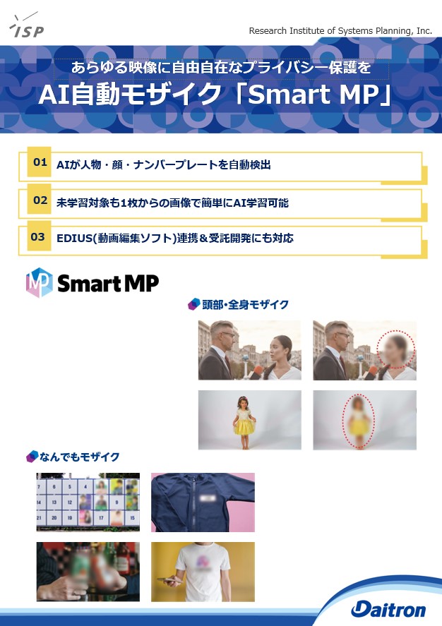 製品概要Smart MPは、AI技術を活用して人物・顔・ナンバープレートを自動検出し、瞬時にモザイク処理を施すソフトウェアです。 これまで手作業で行っていた煩雑な映像のプライバシー保護作業を、Smart MPが全自動で効率化。 高精度なAIが対象を正確に認識し、スムーズかつ確実にモザイク処理を実行します。 また、映像編集の手間を大幅に削減し、安心・安全なデータ公開をサポートします。製品特長■AIが人物・顔・ナンバープレートを自動検出