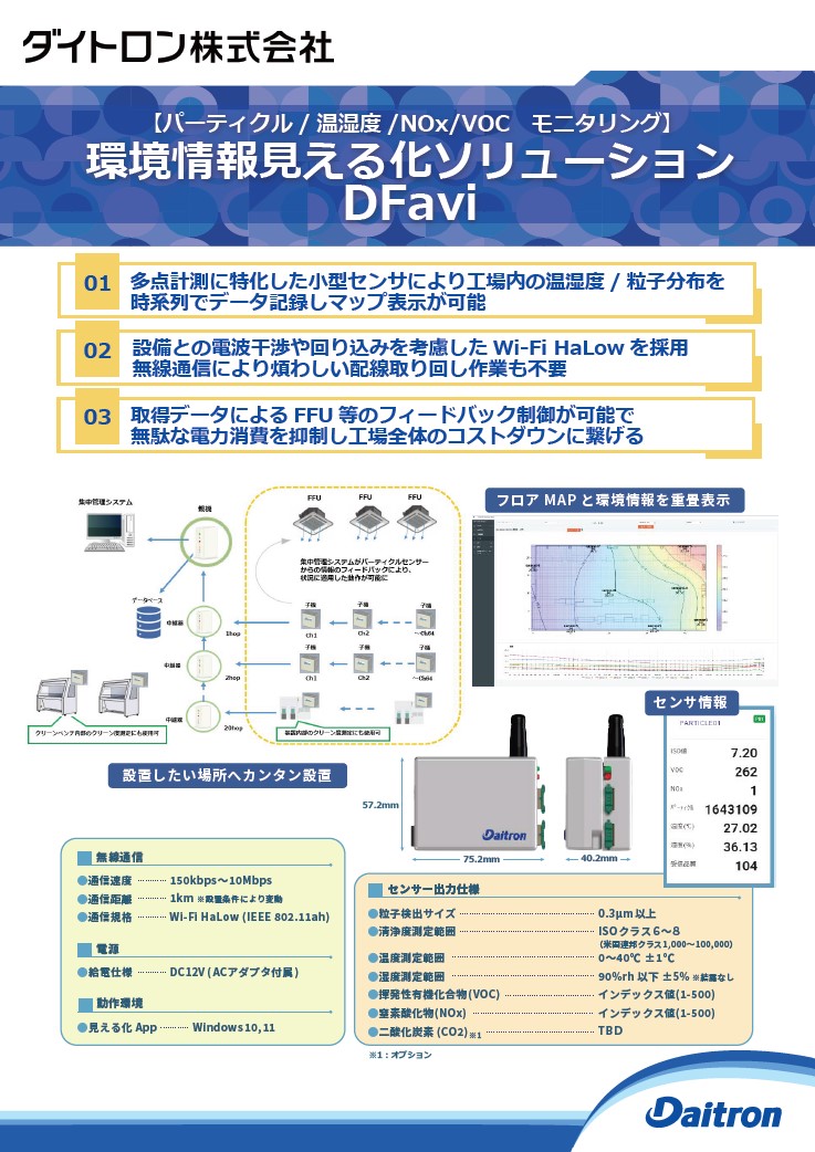 製品概要環境情報を一元管理し、工場内の状況を可視化。 パーティクルや温湿度を測定するセンサーを観測各所へ設置し、弊社製アプリとの連動により状況の監視及び見える化を実現。 サスティナビリティを意識した取り組みに貢献します。製品特長■多点計測に特化した小型センサにより、工場内の温湿度/ 粒子分布を時系列でデータ記録し、マップ表示が可能