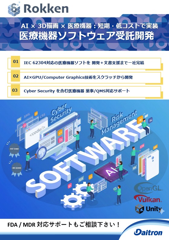 製品概要医療機器向けソフトウェア開発に特化し、着想段階から設計トランスファーまで一気通貫で支援します。IEC 62304対応開発に加え、医療画像・信号処理のAI開発、GPUを活用した3D描画技術まで、短期・低コストで実装可能です。規制対応の文書支援・コンサルも提供します。製品特長■IEC 62304対応の医療機器ソフトを 開発+文書支援まで一社完結