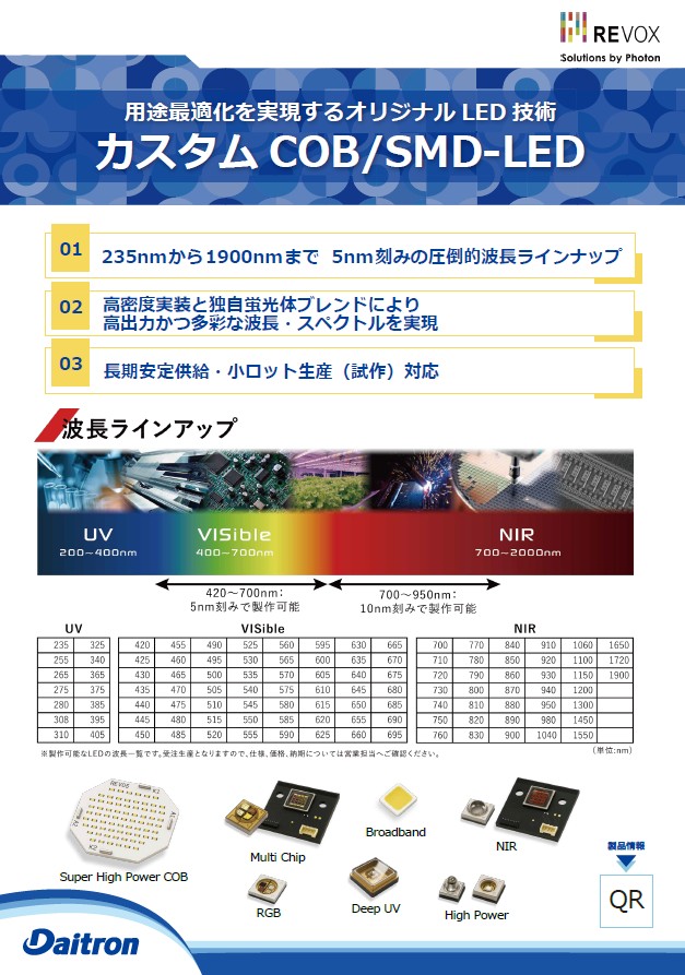 製品概要レボックス株式会社は、高性能LEDおよび光源・照明ソリューションを専門とするメーカーです。 既製品を当てはめるのではなく、必要な波長・出力・スペクトル・光学特性を基点に最適なLEDおよび光源を設計するアプローチを採用しています。 その結果、光の特性がシステム全体の性能や品質に大きく影響する分野において選ばれており、これまで多様な産業分野に向けて最適化されたLEDおよび光源・照明装置を提供しております。製品特長■235nmから1900nmまで、5nm刻みの圧倒的波長ラインナップ